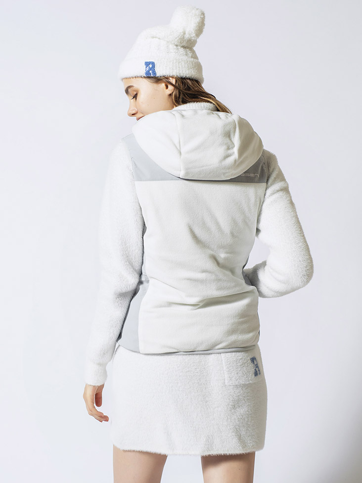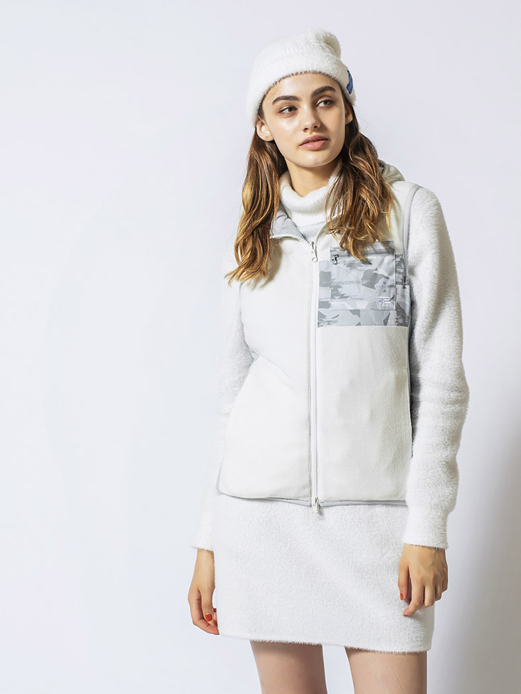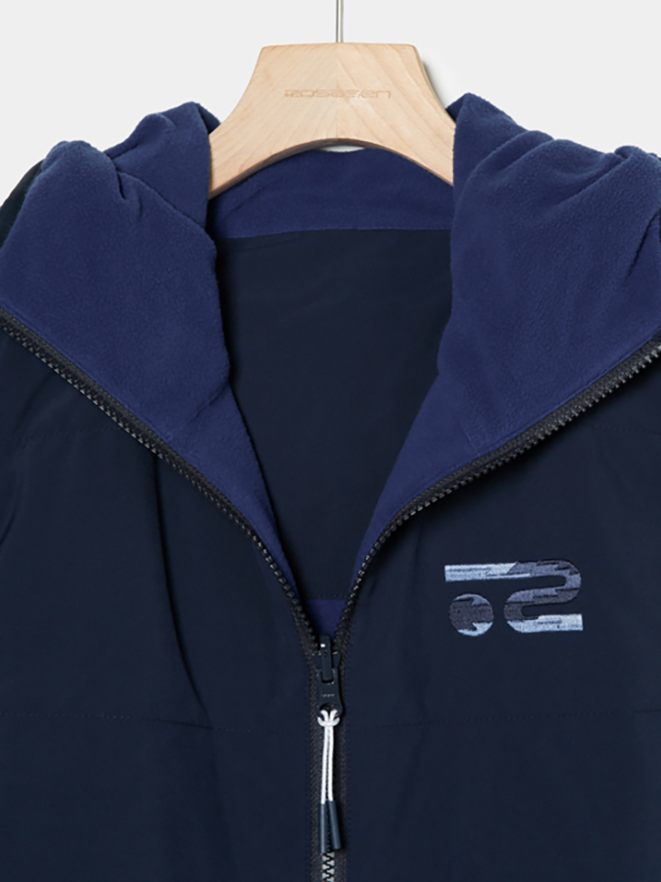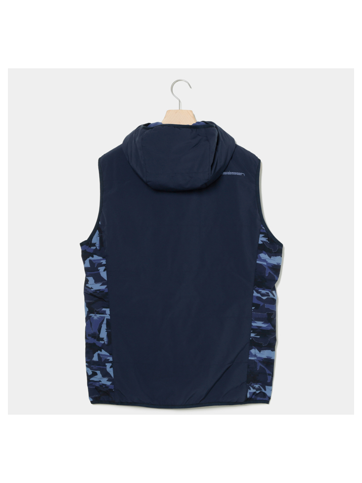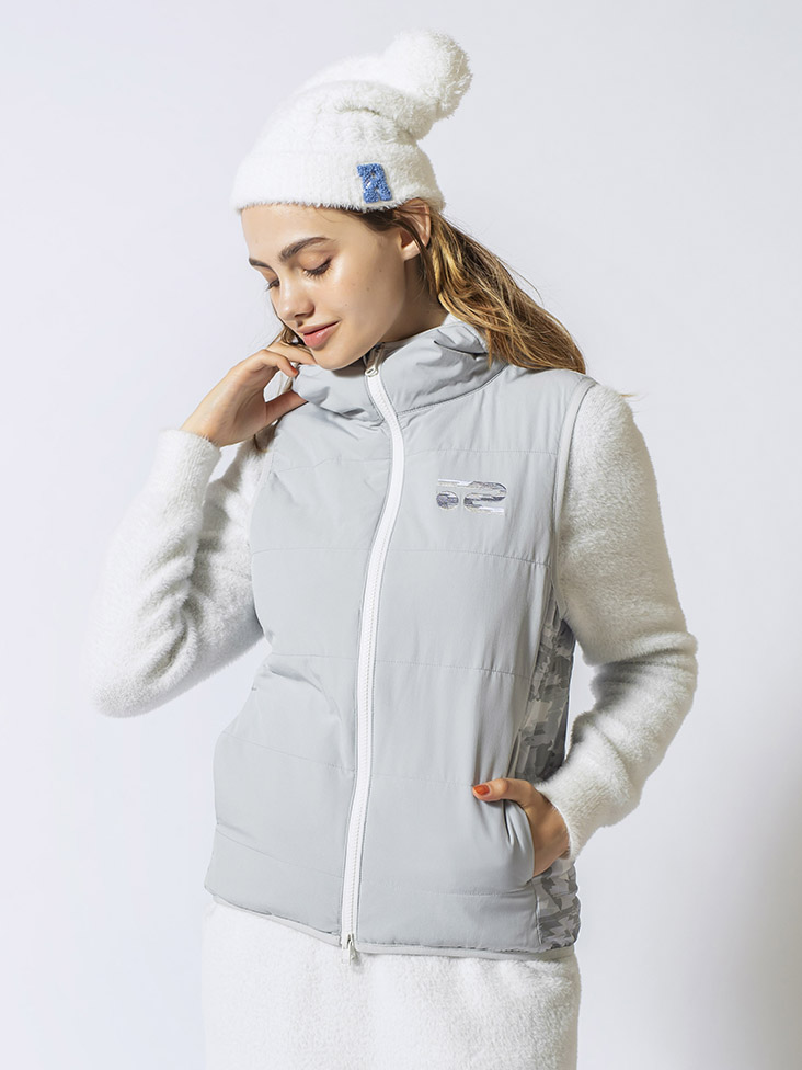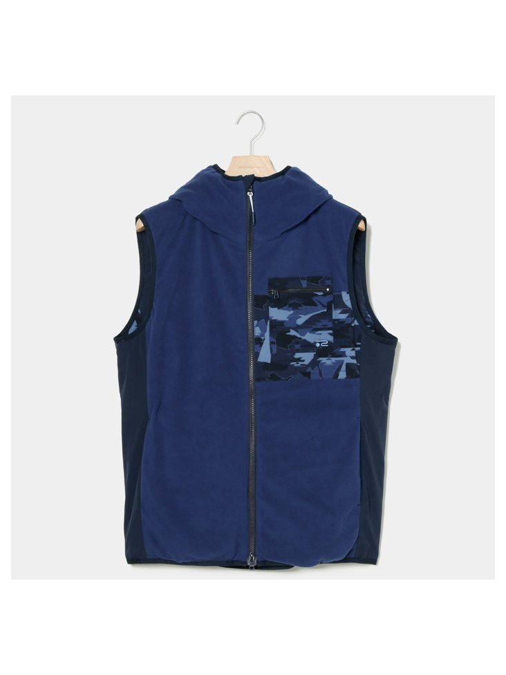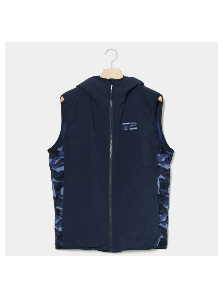 「振れる中綿」と同素材・リバーシブル仕様のフード付きベスト。