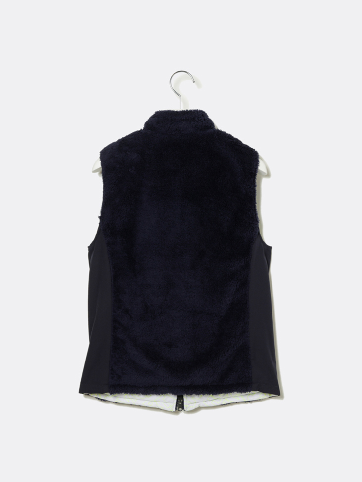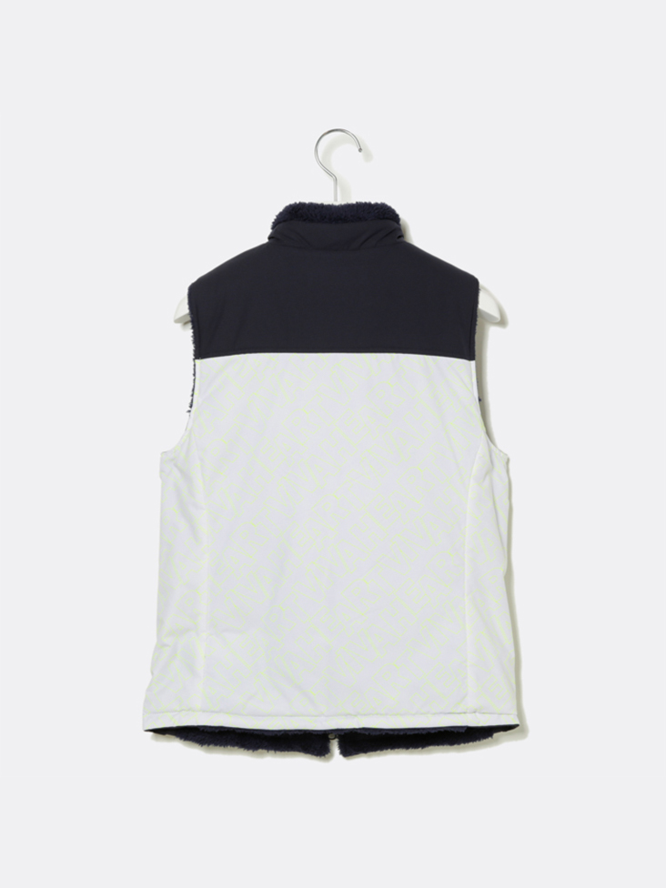 珊瑚フリースと大胆にロゴプリントの入ったタフタとのリバーシブルベスト。可愛さのあるボアフリース面とスポーティなプリントのタフタ面、二面性のあるベストはコーディネートのアクセントにも、防寒にも役に立つ優れたアイテムに仕上げています。中綿部分はストレッチ中綿を使用しており、スイング時のストレスも軽減。