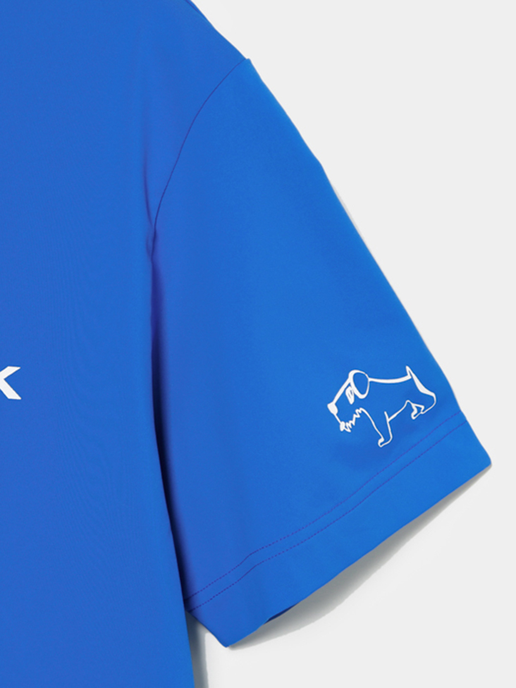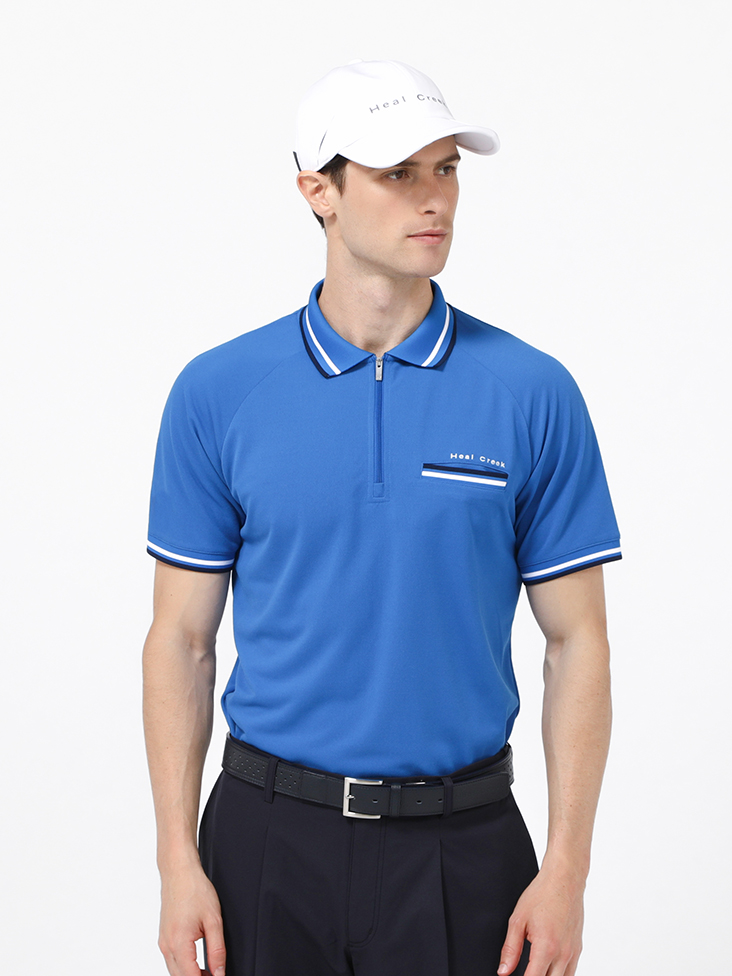 ヒールクリークのキャラクター「ヘンリー君」のアイコンと青木プロのオリジナルロゴが袖口にデザインされたモックネックシャツ。パウダリータッチが気持ちよく、着た瞬間に涼しさと気持ちよさを体感できます。真夏まで重宝する、スポーティに着こなしたいときにおすすめなアイテムです。