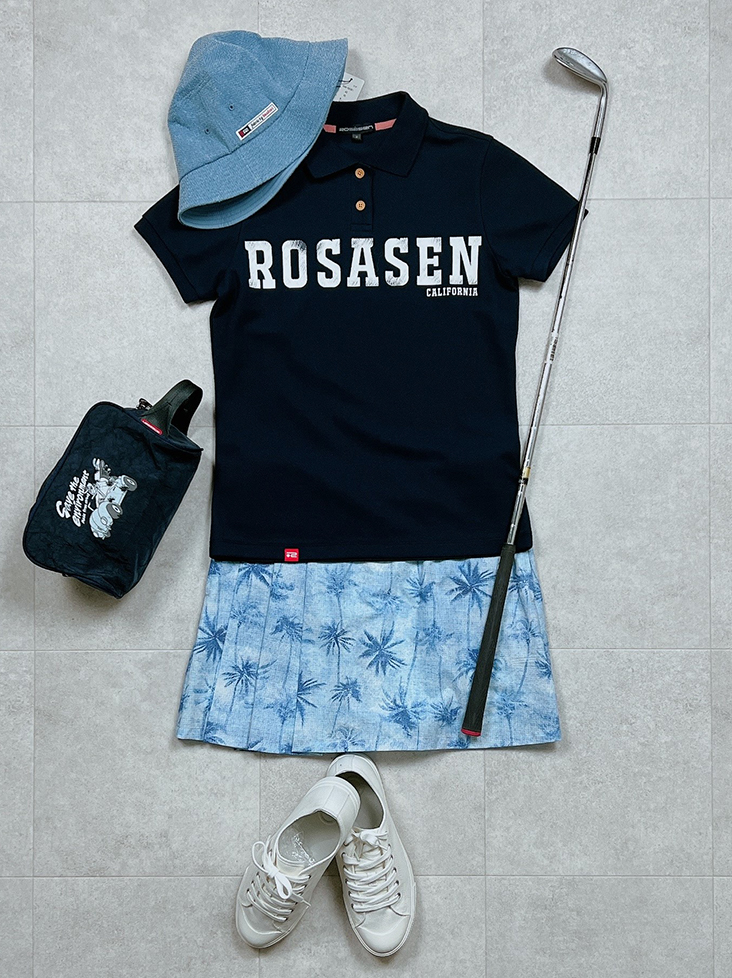Rosasenらしいヤシの木柄のスカートを合わせることで、