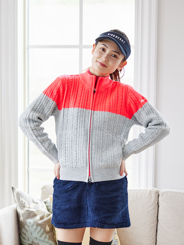 右: 防風裏付きケーブルニットブルゾン 012-57111-073 ¥20,900(税込)