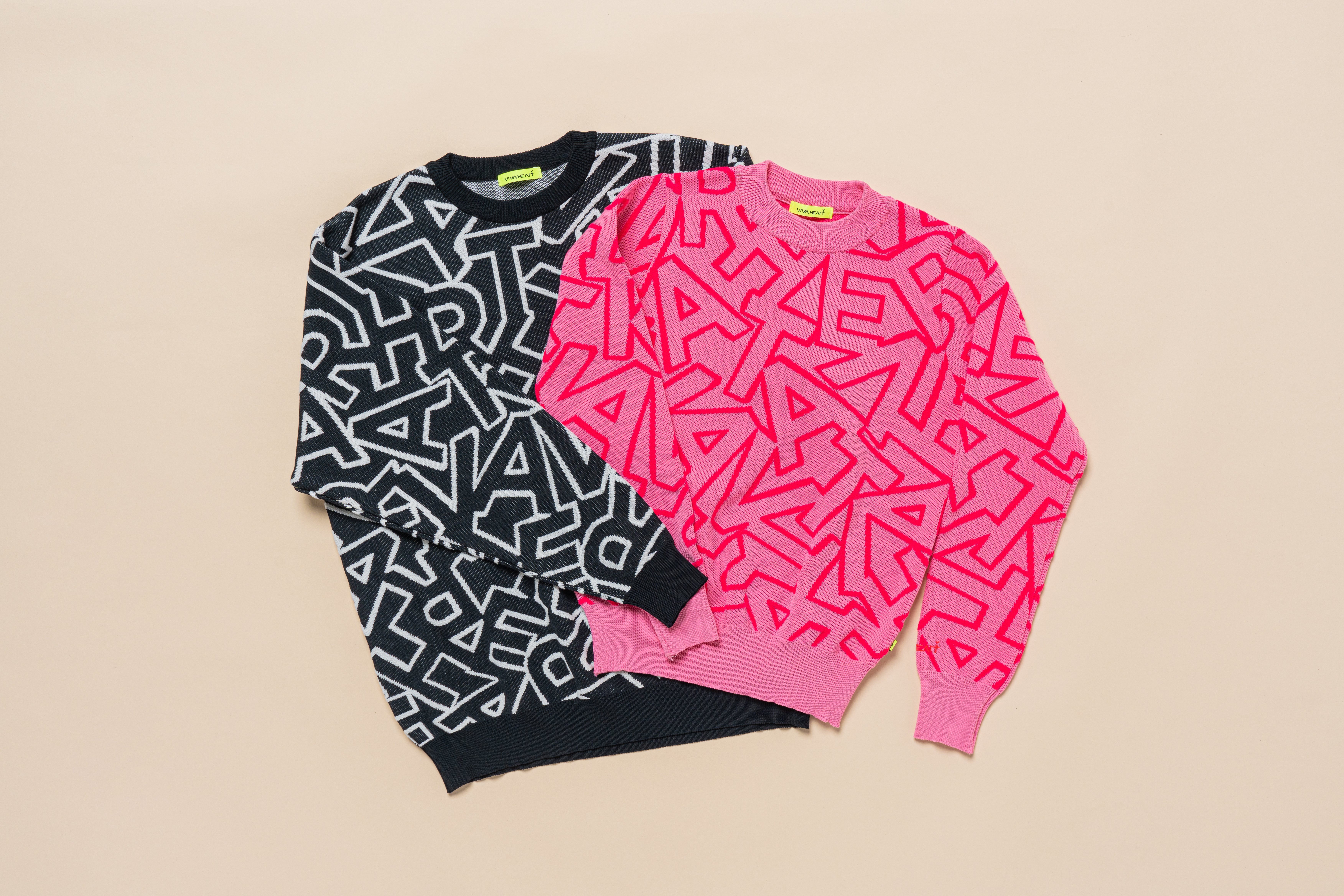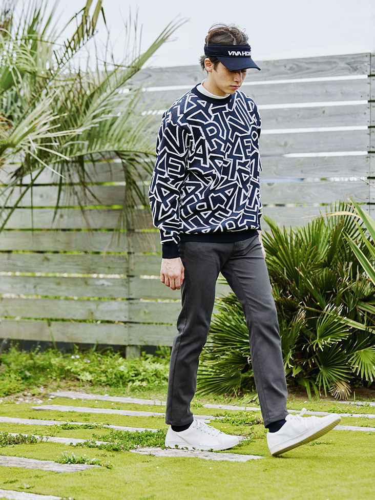 ロゴとジオメトリックを組み合わせたジャガードニットスタイリング