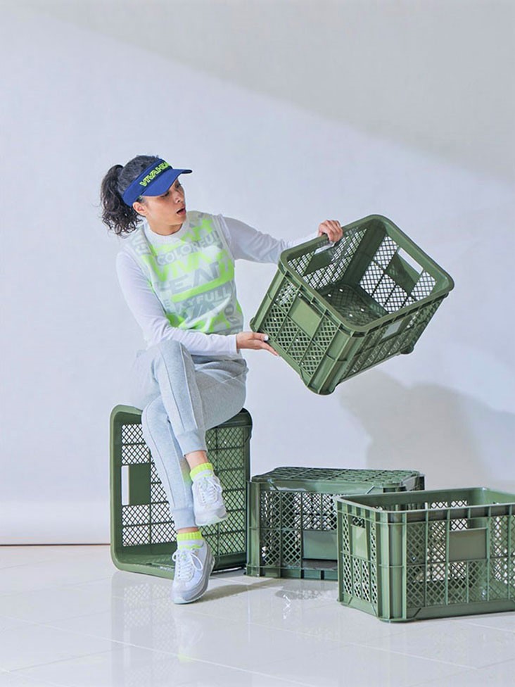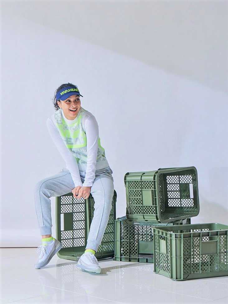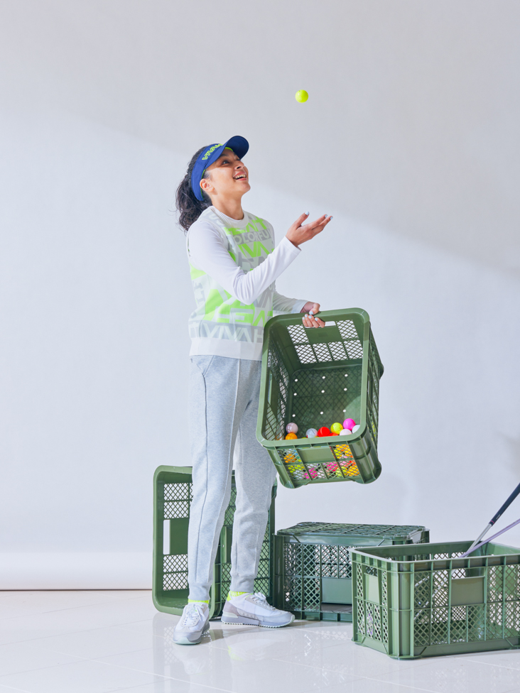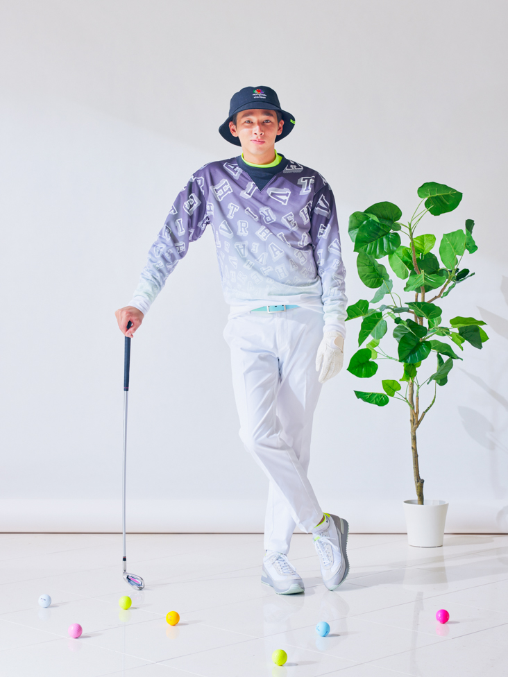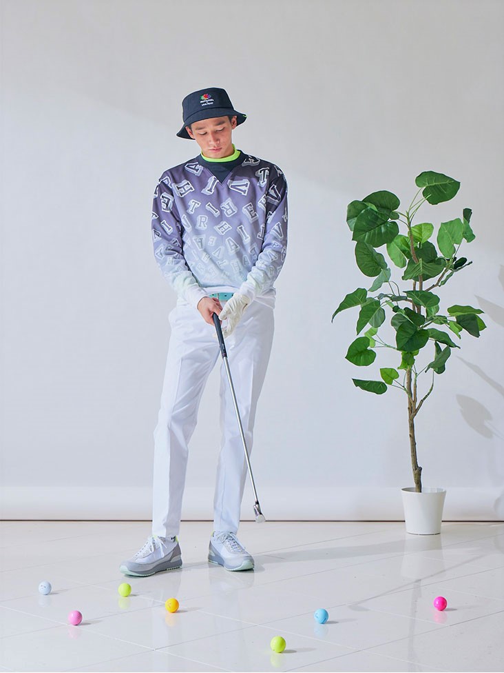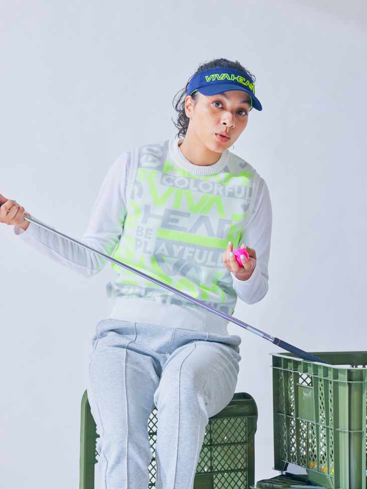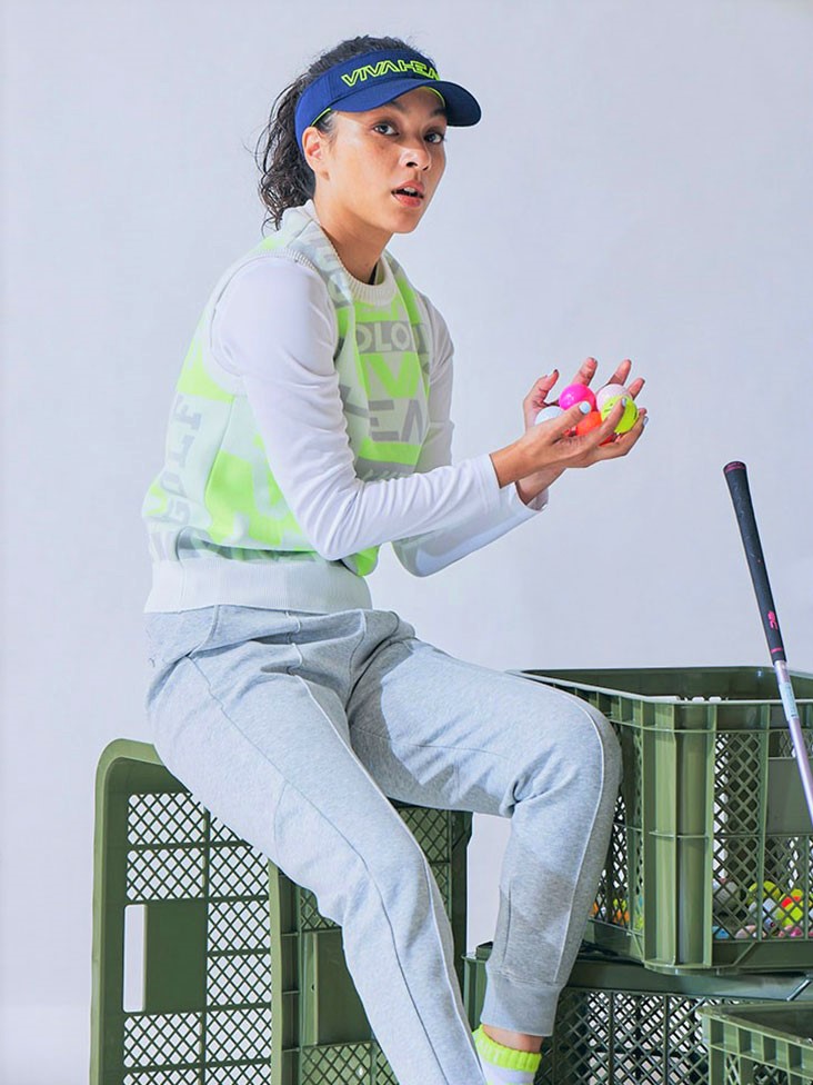 ニットベストのネオンイエローを引き立たせるために、バイザー・グローブ・ソックスにも同色のイエローをポイントに使用したコーデ。ホワイトのインナーモックネックとライトグレーのパンツを合わせたスポーティーで大人っぽいスタリングの提案です📝