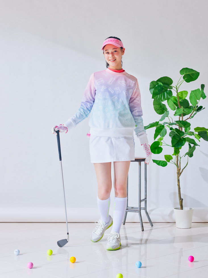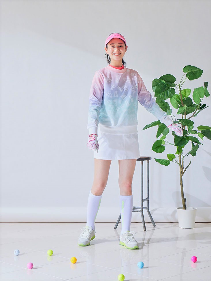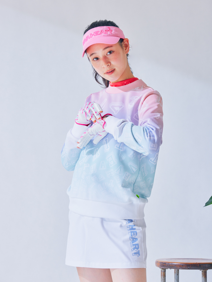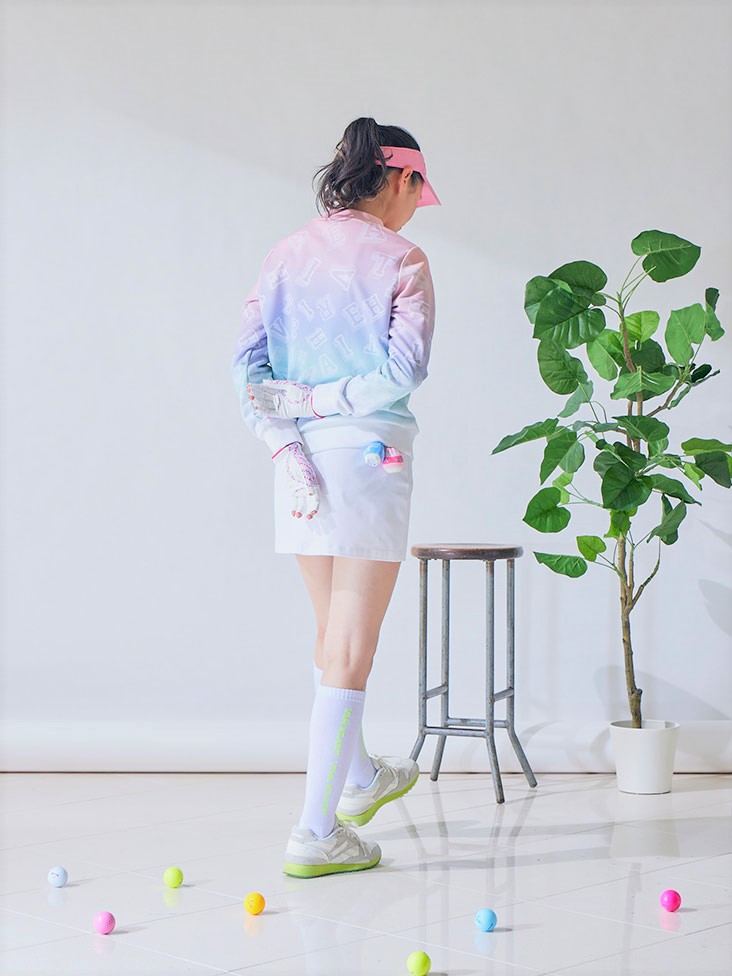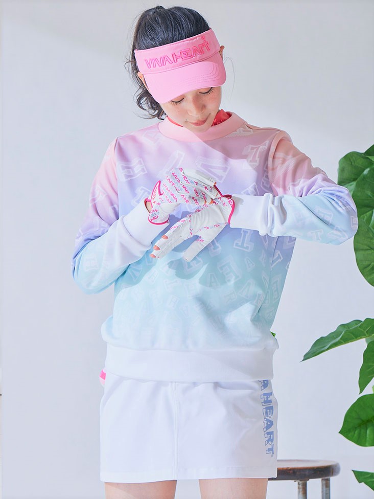 トレーナーのグラデーションカラーに合わせてグローブ・バイザー・インナーモックネックはピンクに、スカートとソックスをホワイトのカラーでまとめまたコーデ。