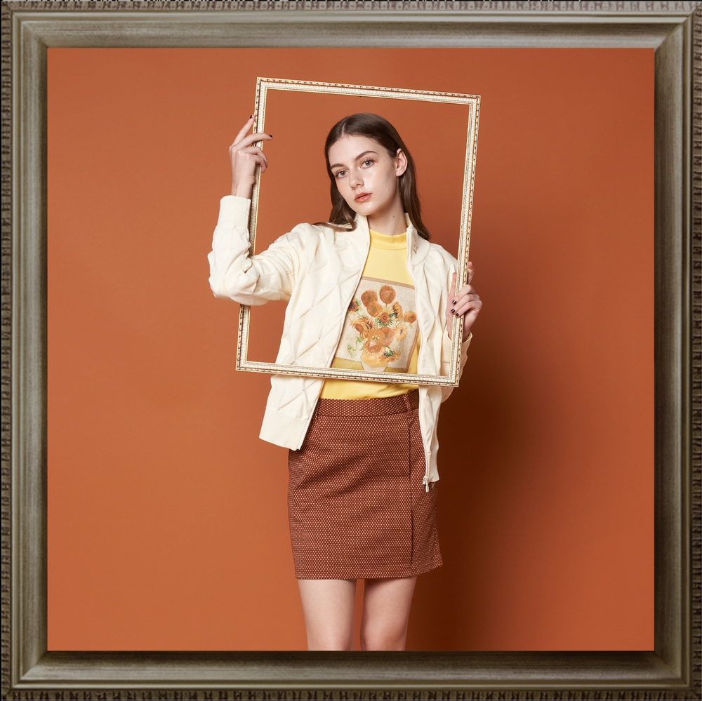 「着る美術館」をテーマにミュージアムピースをセレクト。絵画の中にはハートアイが隠れている、遊び心あるデザイン。