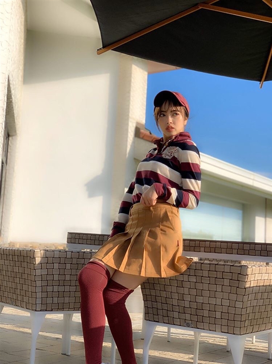 今期カラーのボルドーに洋服のようなラガーシャツ、そしてゴルフウェアではかなり珍しいキャラメルベージュのスカート。