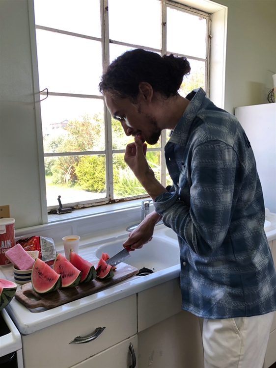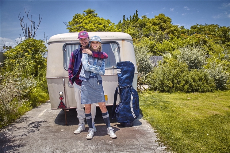 撮影オフショット。真夏の暑い日に秋冬撮影だったので汗だくになりながらがんばってくれたモデルさん。
