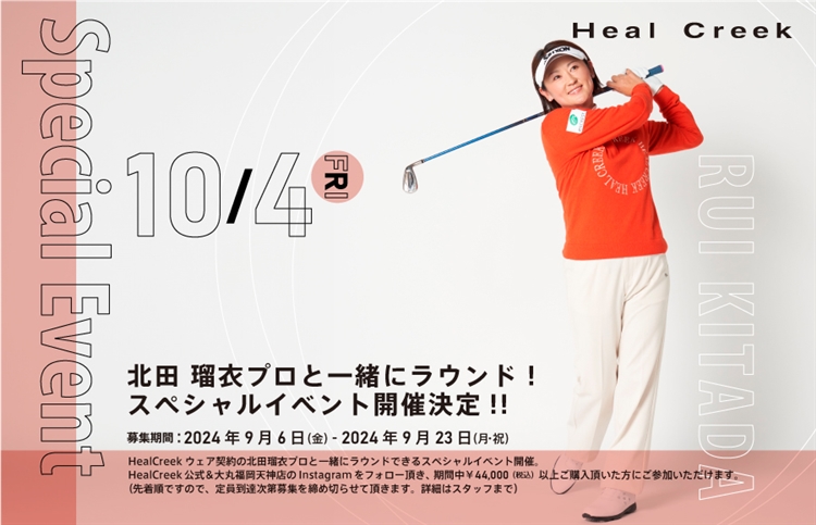 株式会社グリップインターナショナル(本社:神戸市、代表取締役会長兼社長 桑田 隆晴)のオリジナルゴルフウェアブランド「Heal Creek /ヒールクリーク」大丸福岡天神店はこの秋オープン1周年を迎えます。1周年を記念して、Heal Creekウェア契約の北田瑠衣プロと一緒にラウンドできるスペシャルイベントを開催いたします。