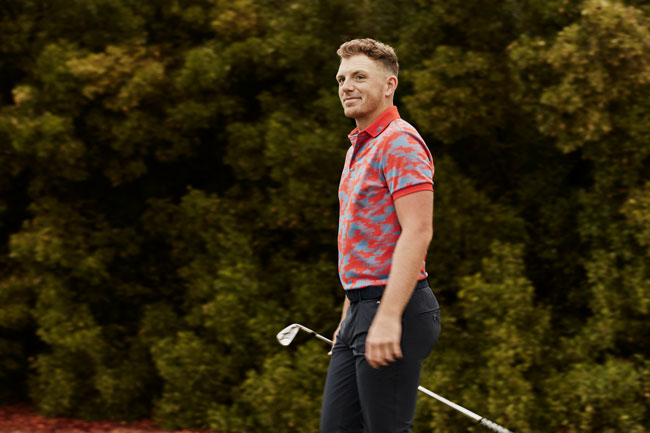 カラーのポロシャツに定番素材のパンツを合わせたシンプルスタイルがまさに、欧米のツアー選手というスタイリング!