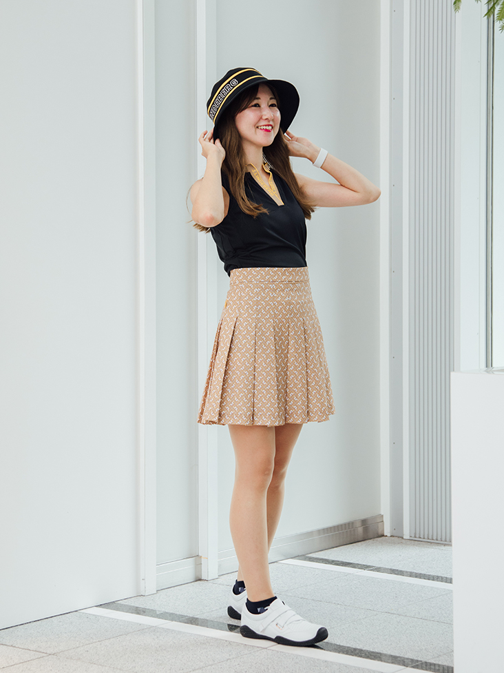 モノグラム柄のプリーツスカートがブラックに負けない主役に