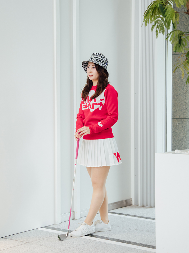 プリーツスカートの後ろ部分にもロゴが入っているので、動くたびに赤が目立つのもポイント!