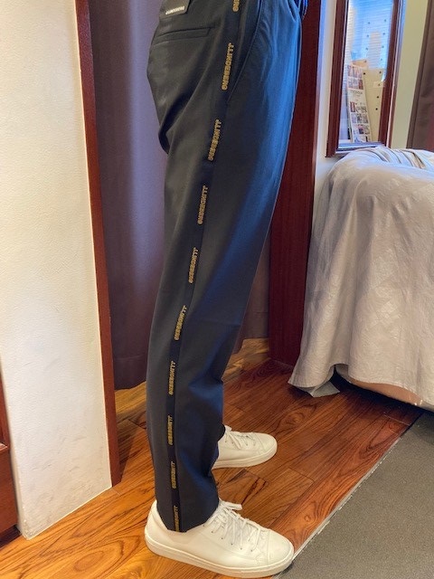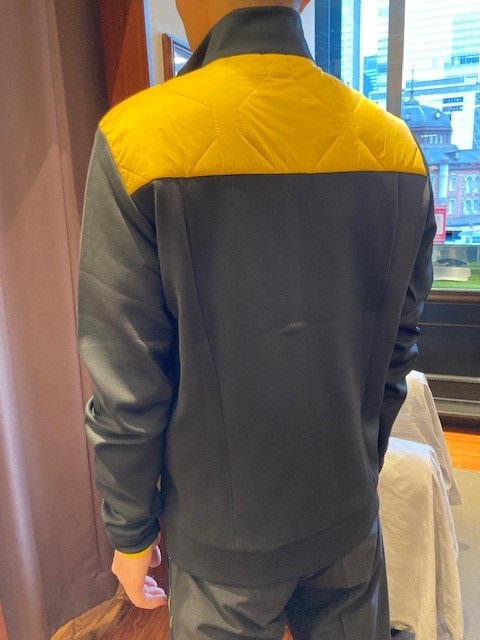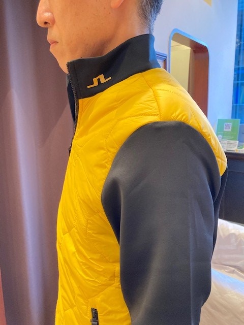 JLイエローレタリック側章パンツで足長スタイルを強調。トップスキルティングで保温性高く、オータムのフェアウェイに目立つ同系色で統一感ある大人コーデがポイント。