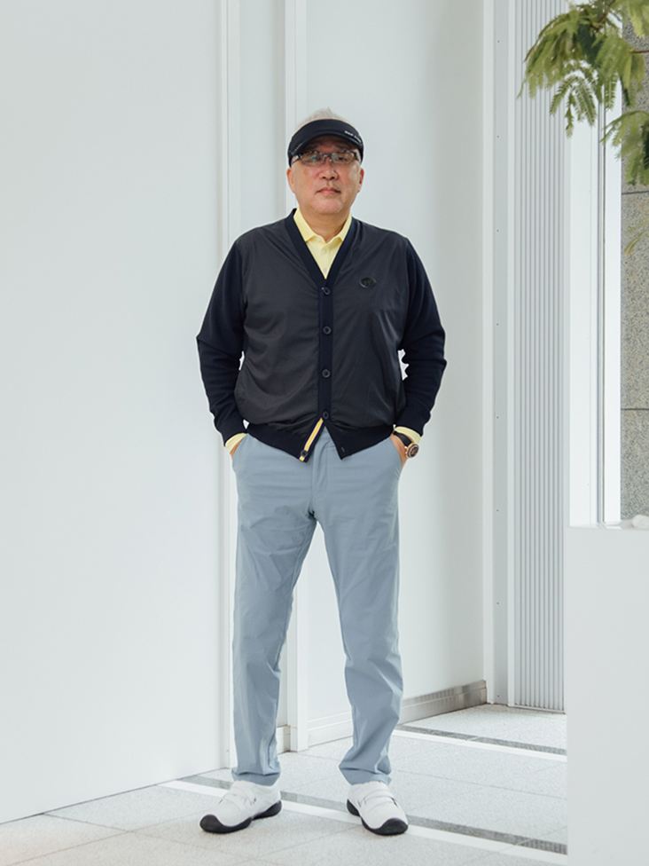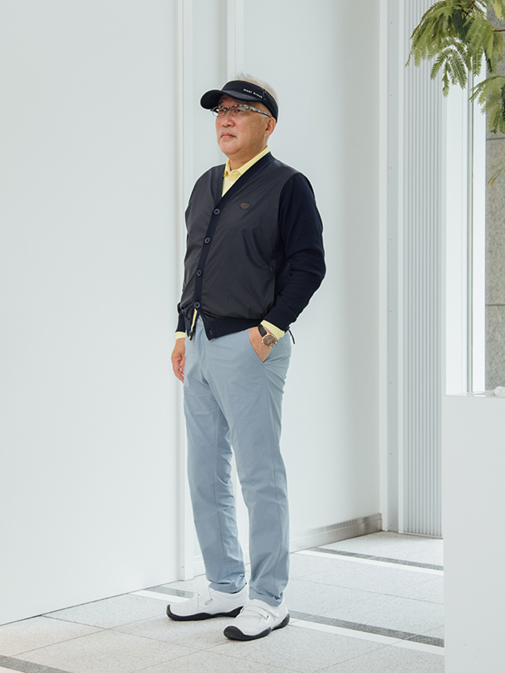秋とはいえ暖かい日もあり、ゴルフは特に体感温度がホールホールで変わるスポーツですので、カーディガンの着用で簡単に脱ぎ着出来るスタイルはプレーにストレスを感じません。