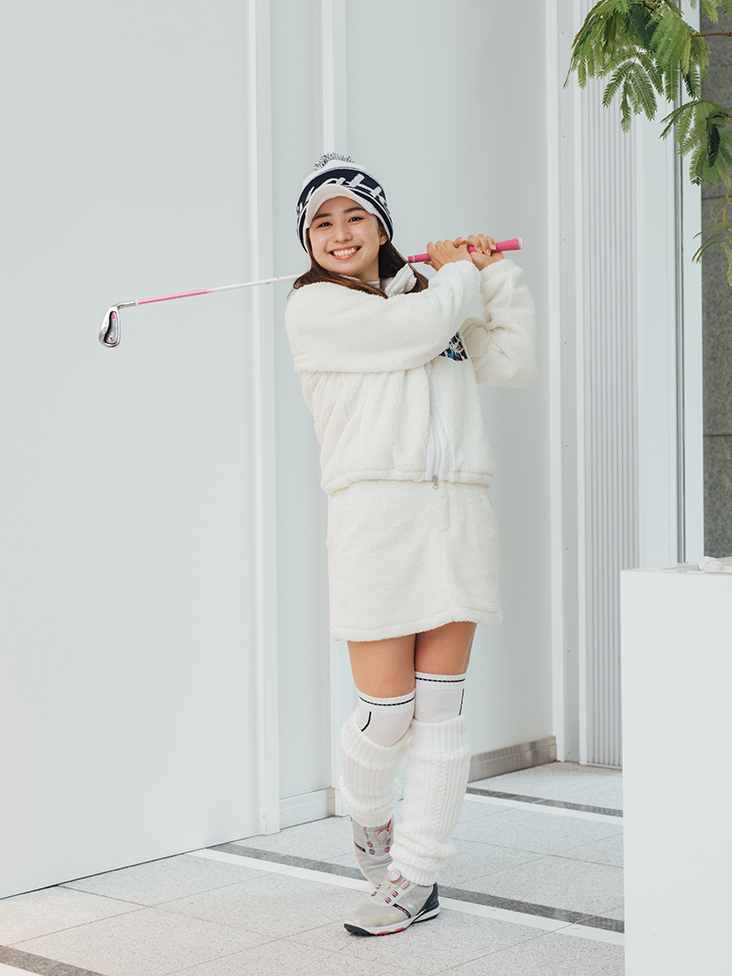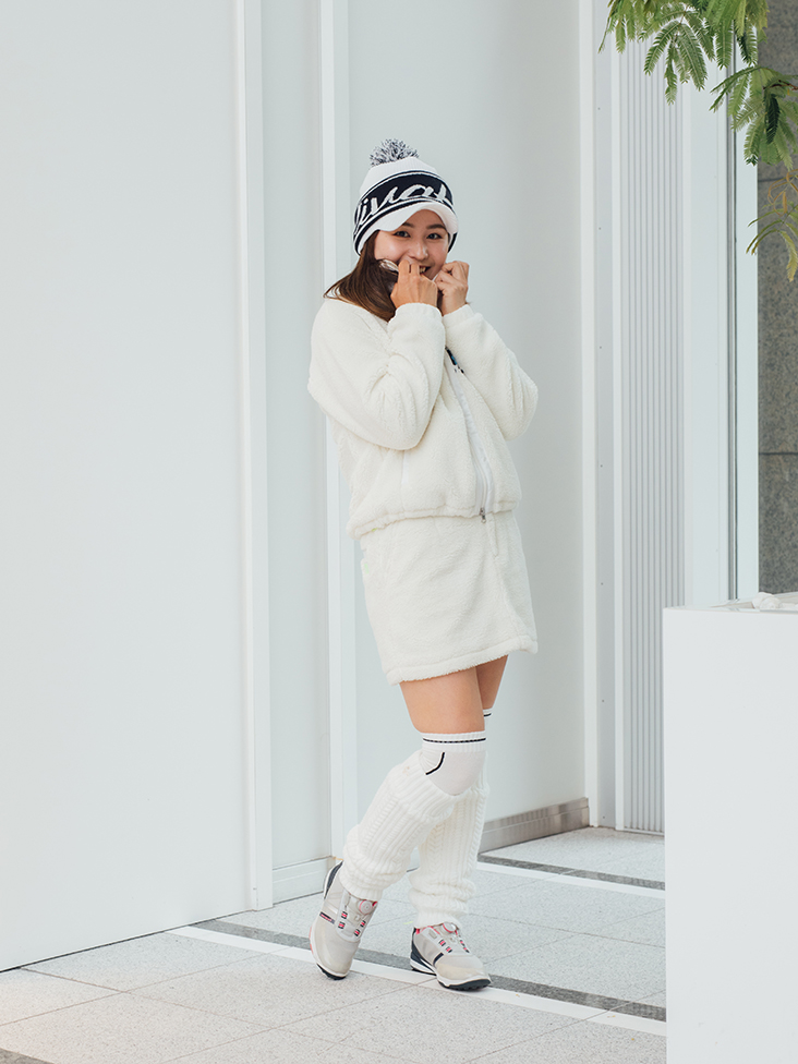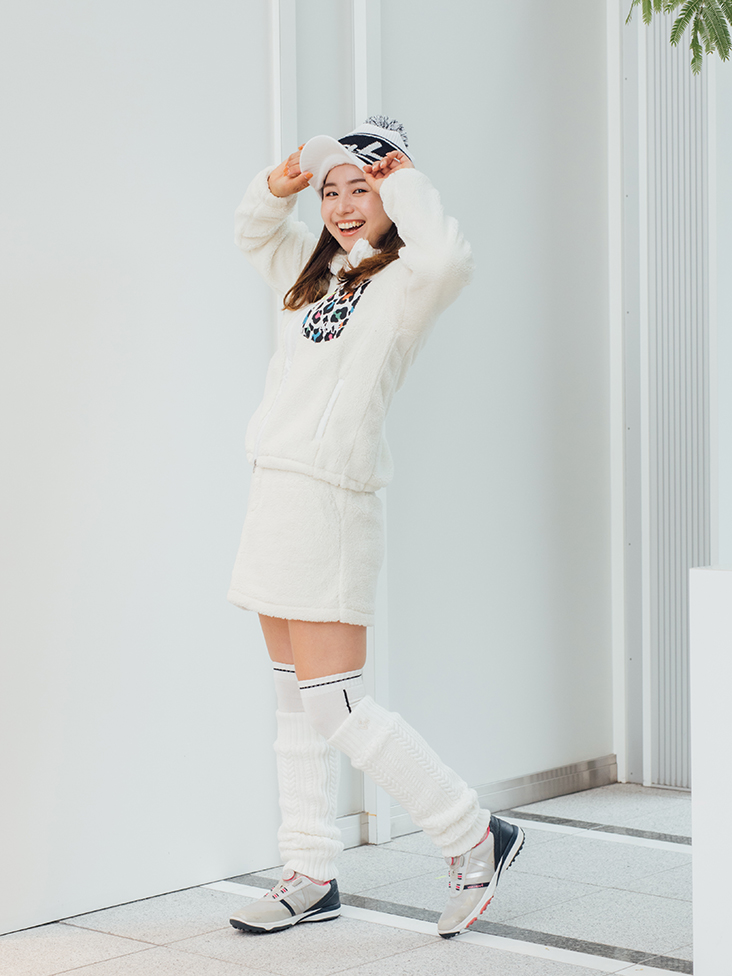 ボアブルゾンとスカートの身頃部分はストレッチ素材なので、可愛いさと快適さを兼ねそろえた冬のゴルフの必須アイテム◎