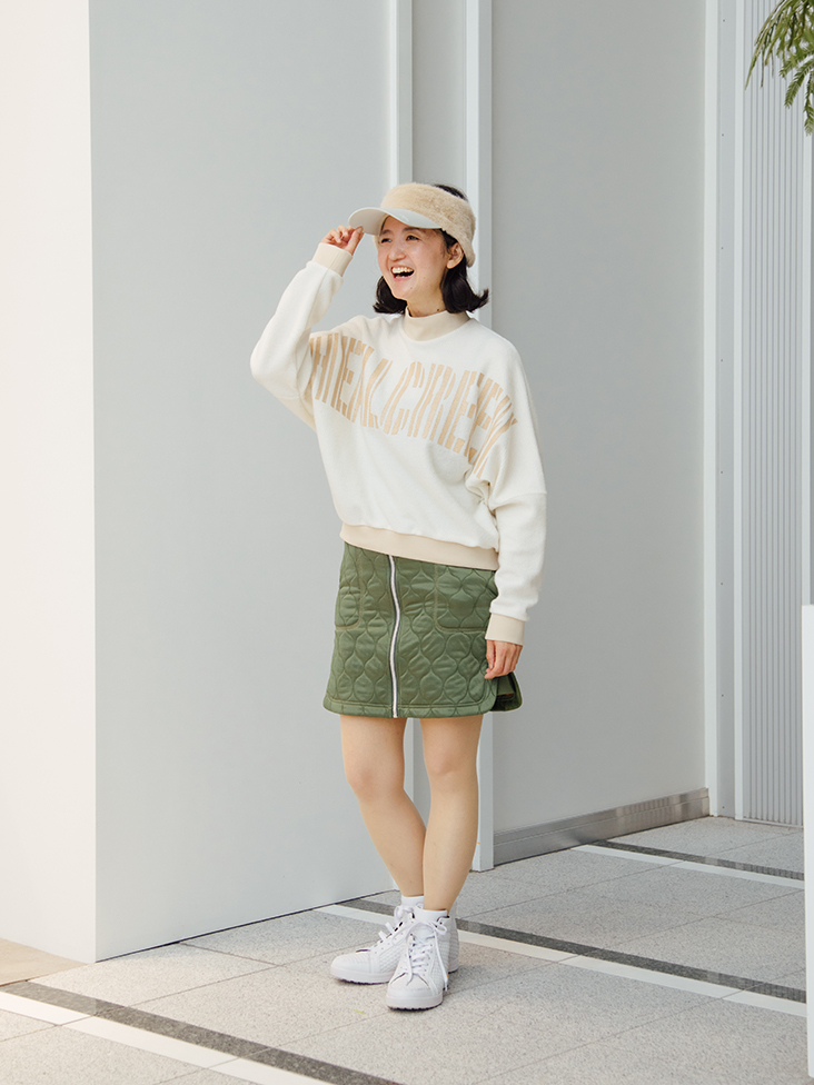 トップスをボリュームのあるシルエットにして変化を出しながら、白系の小物で合わせることで印象が重くならないように気を付けています。
