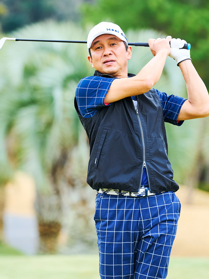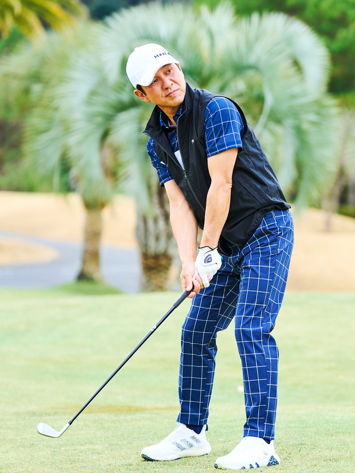 柄×柄で重く見えがちな組み合わせも、無地のベストでしまったクールなコーデに!パンツは涼しくドライな履き心地。ベストはストレッチ性、撥水性、透湿性も持ち合わせており機能面でも優れています。