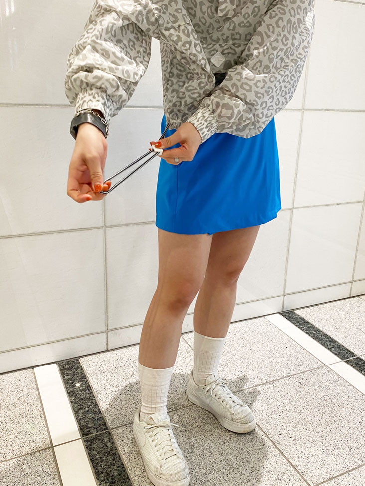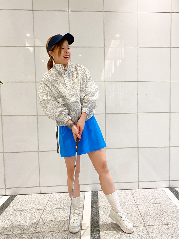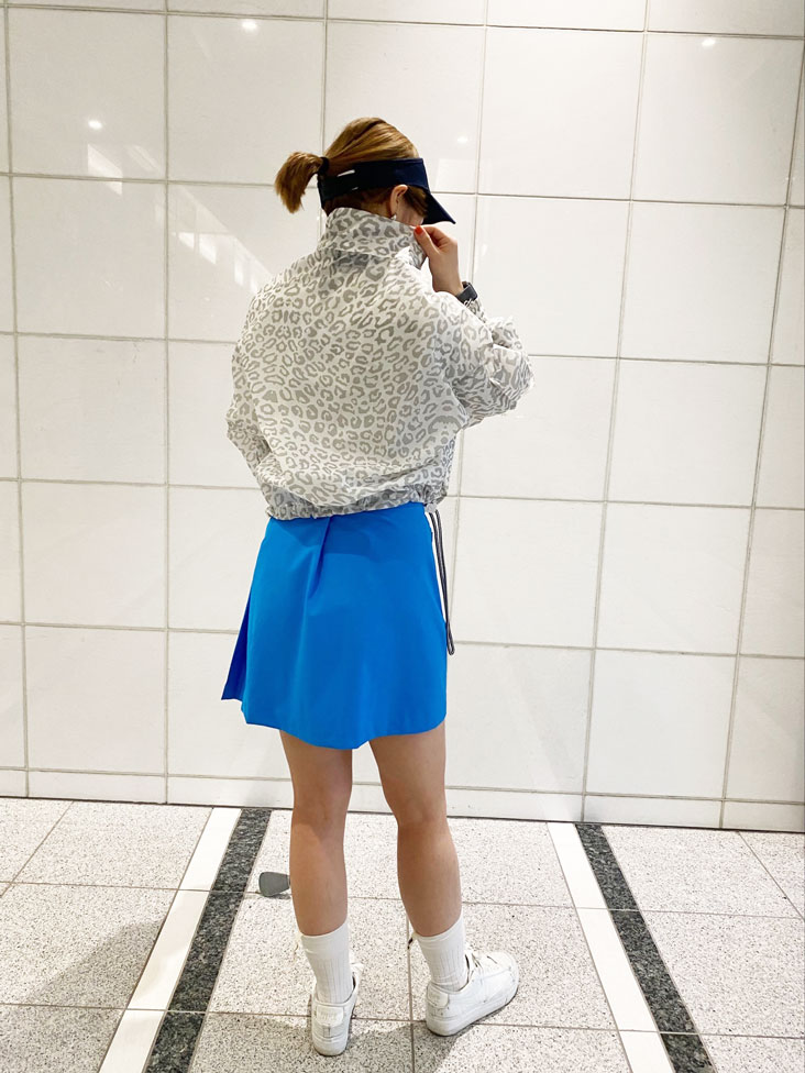 派手すぎないグレーのレオパード柄はコーディネートにも取り入れやすく、綺麗目なブルーのスカートと相性◎