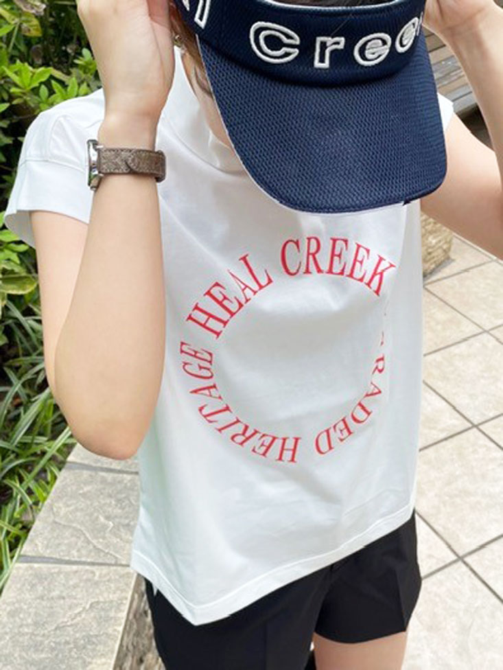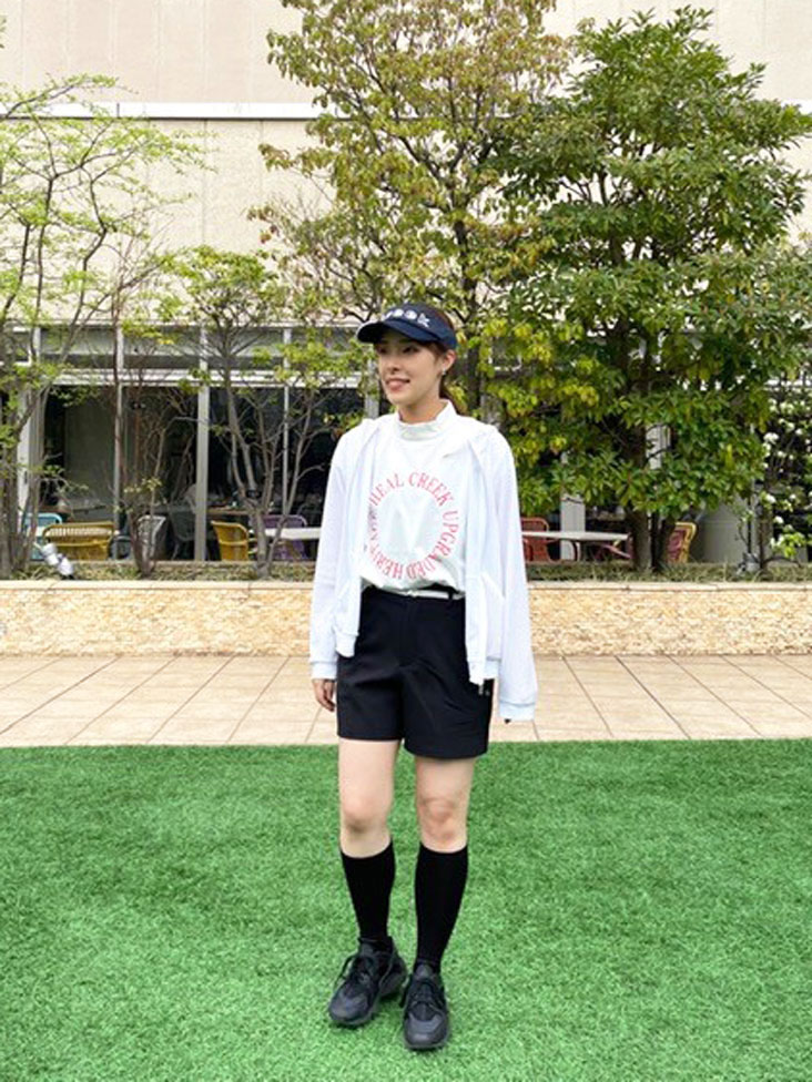 ロゴが可愛いモックネックのTシャツに黒のショートパンツを合わせて、スポーティーで動きやすいコーデ。