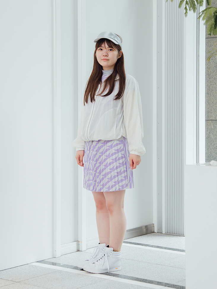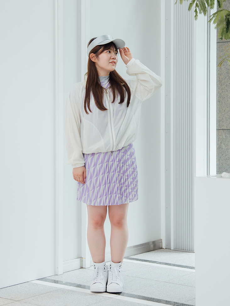 パープルの色と柄が可愛いので、スカートと半袖モックネックをセットアップにしました。