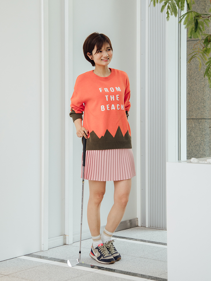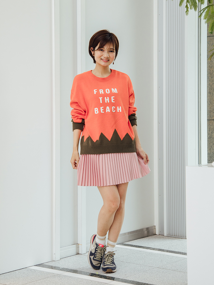 リラックス感のあるオレンジのローゲージのコットンニットとピンクのプリーツスカートをコーディネート。
