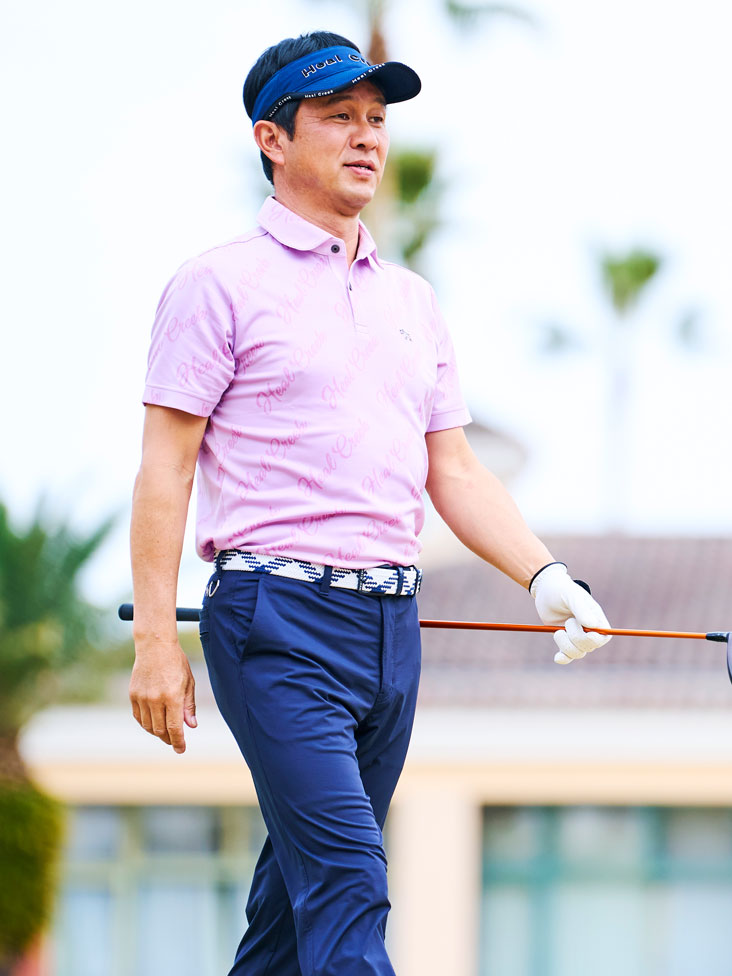 筆記体ロゴジャガードが上品なイメージの半袖ポロシャツ。一見手を出しづらいパープル系のカラーもネイビーと合わせると大人のカラーコーデに。サンバイザー・ベルトなど小物もネイビーでまとめることでコーデがまとまり、ポロシャツが主役のコーデに!