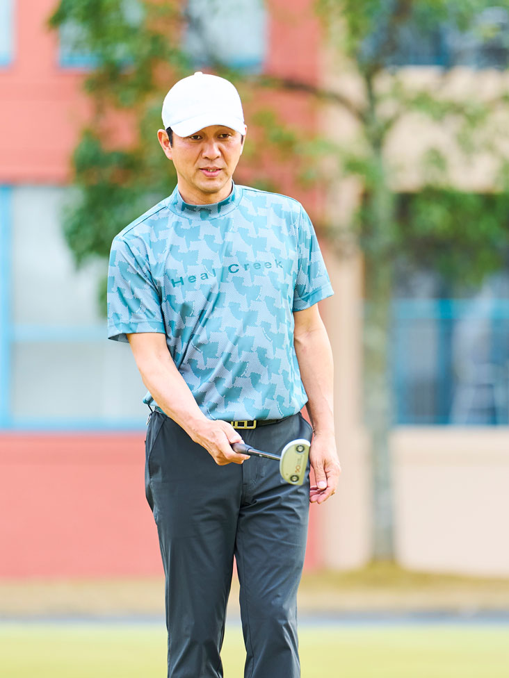 程よいワッシャー感がカジュアルにも見せてくれるパンツはダークブラウン。後ろのポケットは4つに分かれているので持ち物が多いゴルフならではのアイテム◎カーキ×ブラウンで秋口まで着用いただけるコーディネートです。