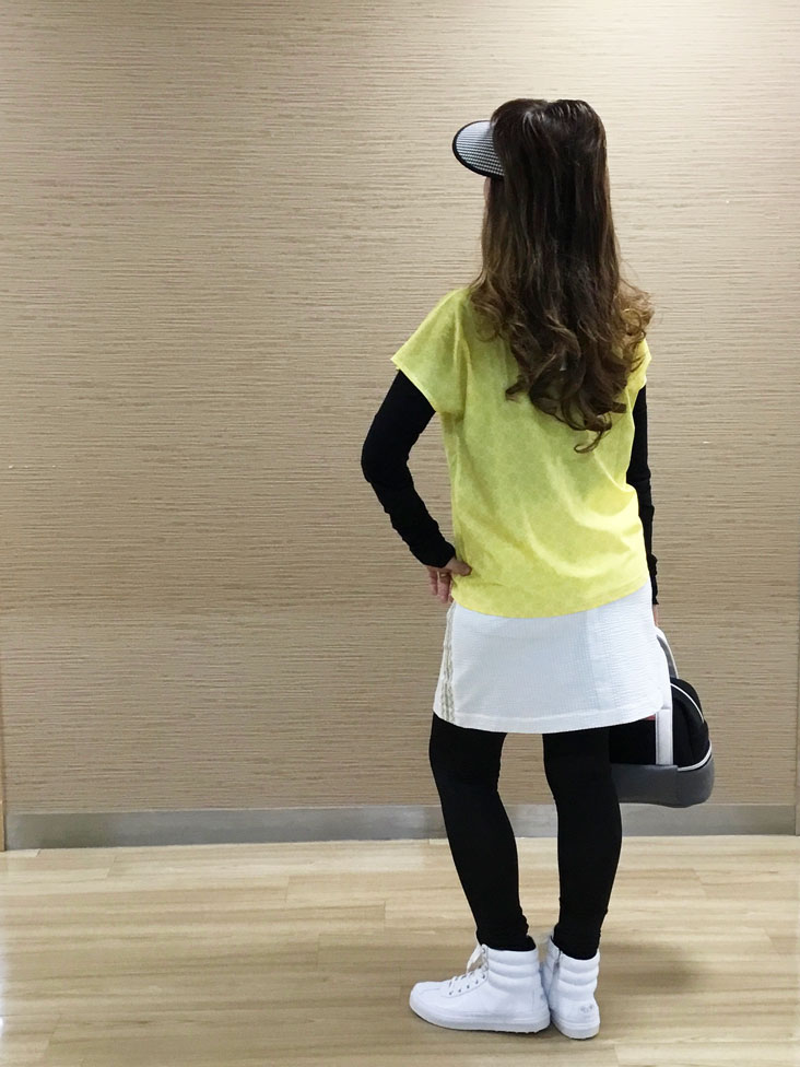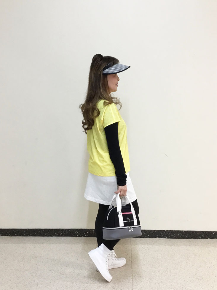 ノンストレスな着心地のドルマンタイプのゆったりシャツに、シンプルな台形スカート。個性的なビンテージ風のプリントで個性的にしており、肌離れの良さにストレッチもあり。この時期のゴルフにおすすめです!