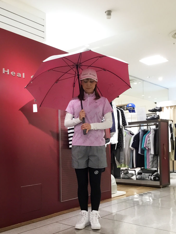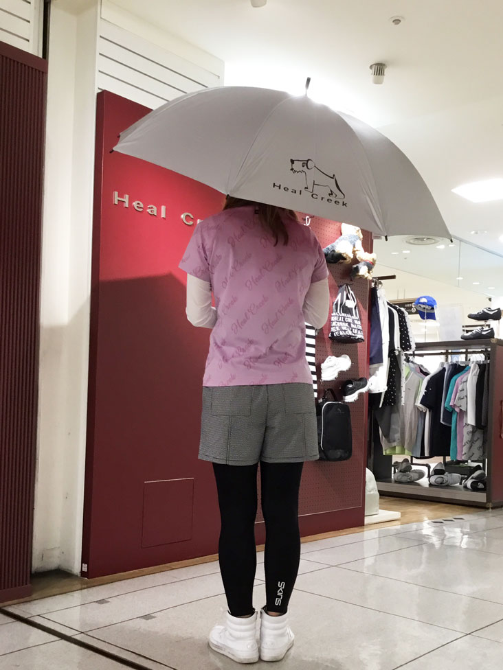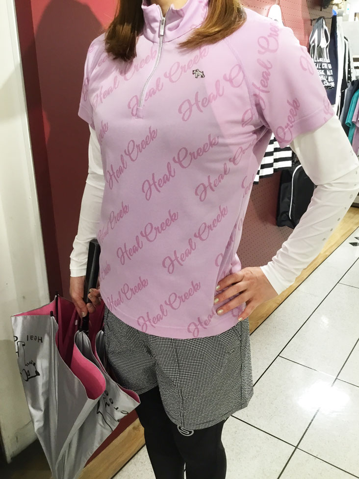 紫陽花カラーのパープルにビビットなギンガムチェックコーデ。ヒールクリークロゴいっぱいがポイント!!ショートパンツは、涼しい素材で、ウエストゴムで快適。ヘンリー君がかわいい!!傘は、梅雨&夏の必需品。