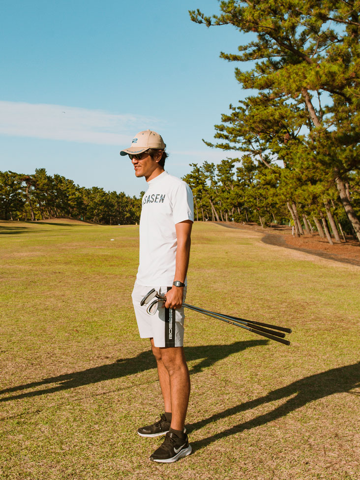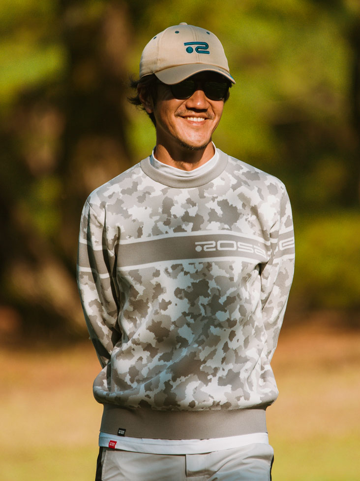 Rosasen23SSの撮影でカメラマンを担当いただいた今井さんに着用いただいたのは、スプラッシュ迷彩柄のニット。ニット素材なのにとても軽く、春から着用頂けます。夏でも朝と夜の寒暖差が心配な時に持っておきたいアイテム◎中には、吸水速乾・UV・ストレッチ機能を併せ持った半袖モックネックを着用しています。パンツはなんと水陸両用!ゴルフはもちろん、マリンスポーツでも使える優れもの◎きちんとストレッチ機能もついています。