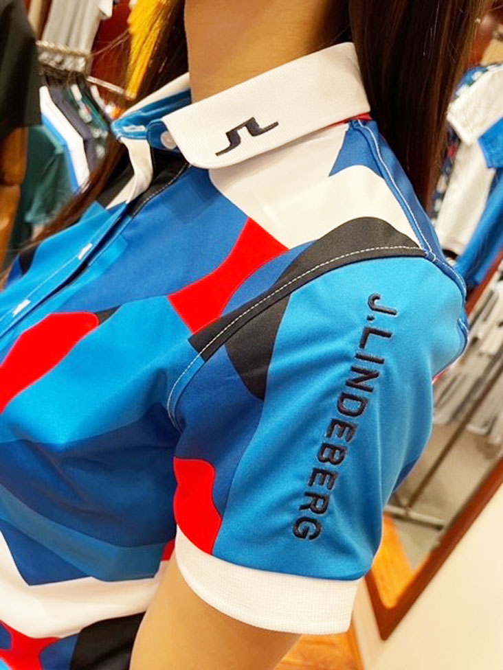特徴的なポロシャツの柄を活かすために白のスカートを合わせて爽やかに!バイザーもトップスと同じ柄です。