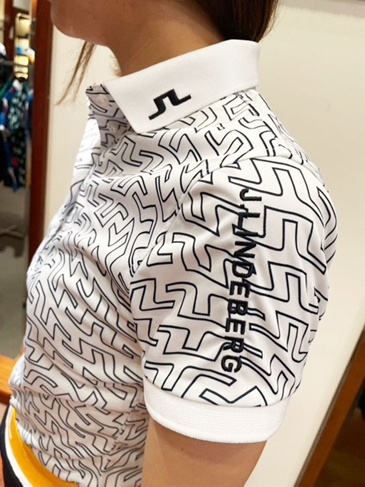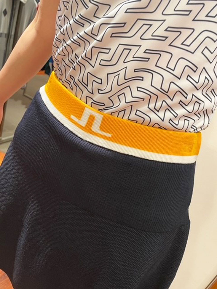 毎年人気のブリッジモノグラム柄に、ネイビーのニットフレアスカートで大人かわいいスタイルに。スカートのベルト部分のイエローが差し色効果でコーディネートを引き締めてくれます。