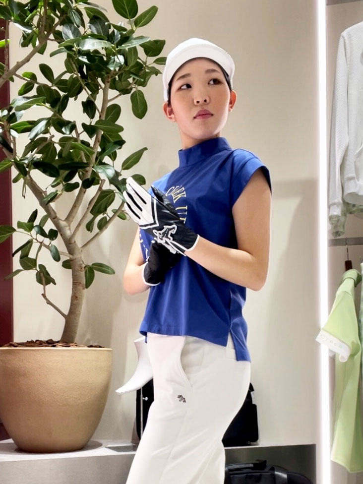 シックなブルーのトップスでおしゃれに動きやすく、プレーが快適にスポーティーなコーデです。