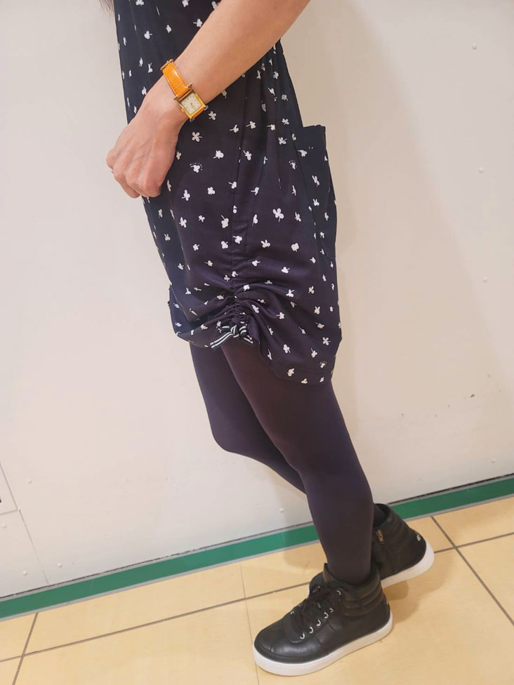 四つ葉クローバープリント、両サイドのストライプテープを調整し裾の変化を楽しめます。ニット衿の配色ラインをきかせて締めています。