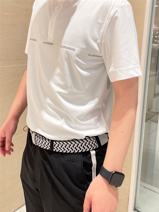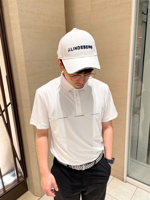 上下共にJ.LINDEBERGの文字ロゴがデザインされた、シンプルに使いこなしやすいコーデに仕上がってます。