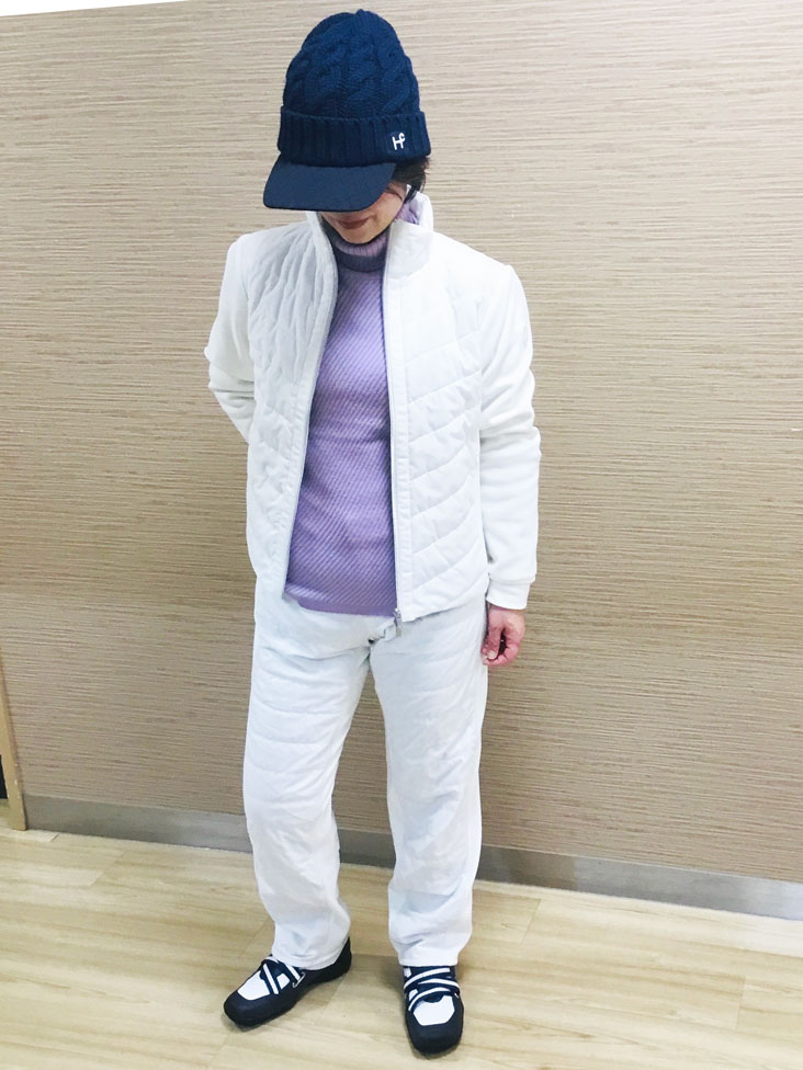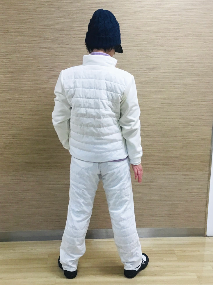 着膨れしやすい冬コーデではなく、ストレッチ性のある起毛ジャージで暖かさと動きやすさだけではない中綿パンツでも美脚ラインを重視したパンツスタイル。