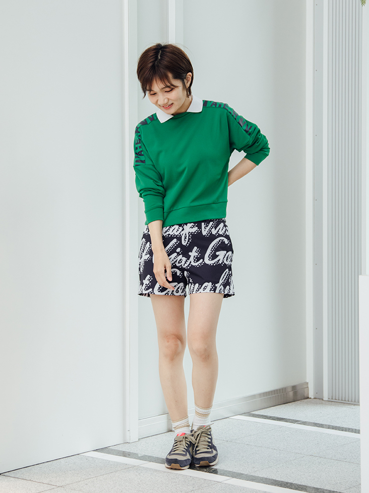 ロゴが目立つショートパンツは、セットアップでの着用も◎
