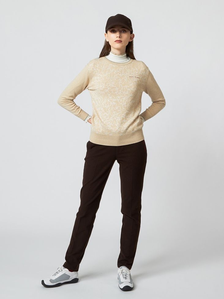 ジェントルなレトロクラシカルをスタイリングで演出。ヘンリー君をさりげなくも大胆にアートに落とし込んだニットの柄が上品なアクセントに。