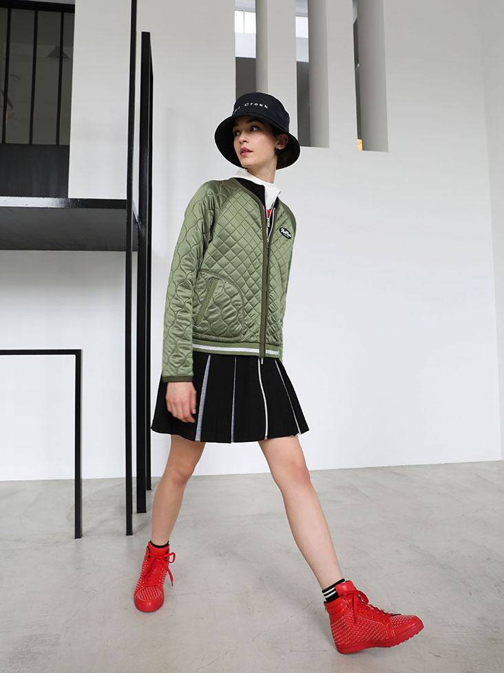 気品ある光沢と艶感、中綿をしっかり詰め込んだ膨らみが特徴で存在感のあるブルゾンに仕上げています。身頃の裏地は防風仕様で冷たい風も防げ、ストレッチ性のあるワンピースはプリーツが動くたびに配色が見えゴルフシーンを華やかに彩ります。