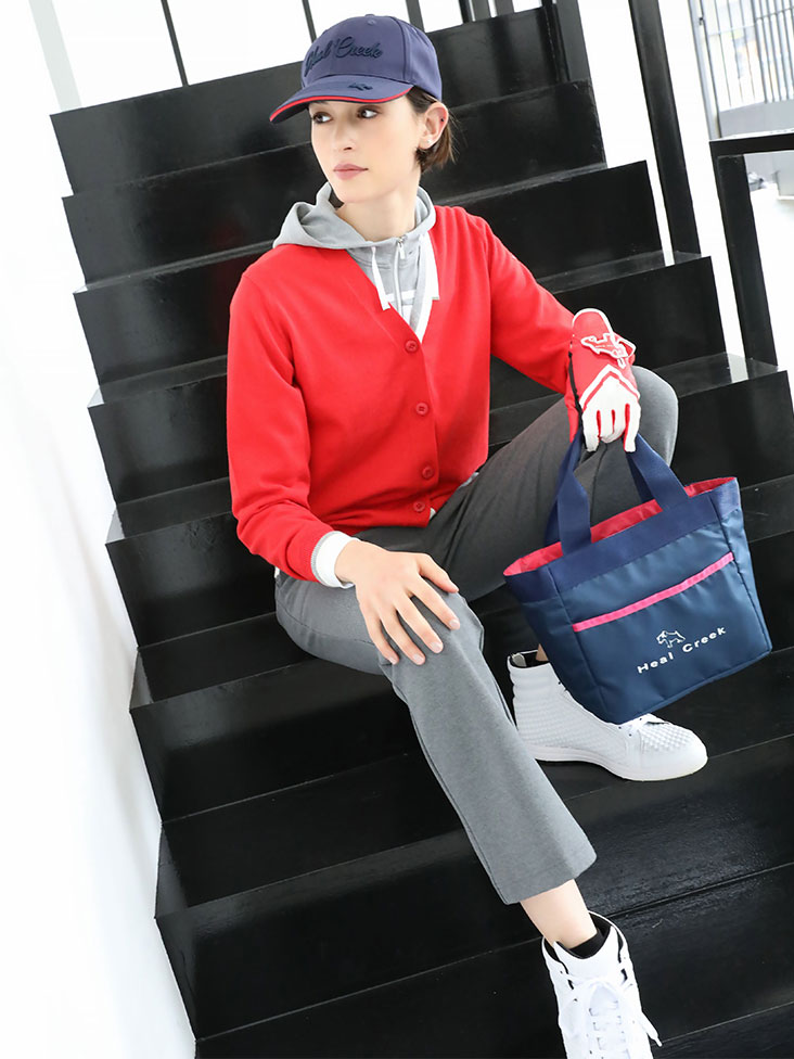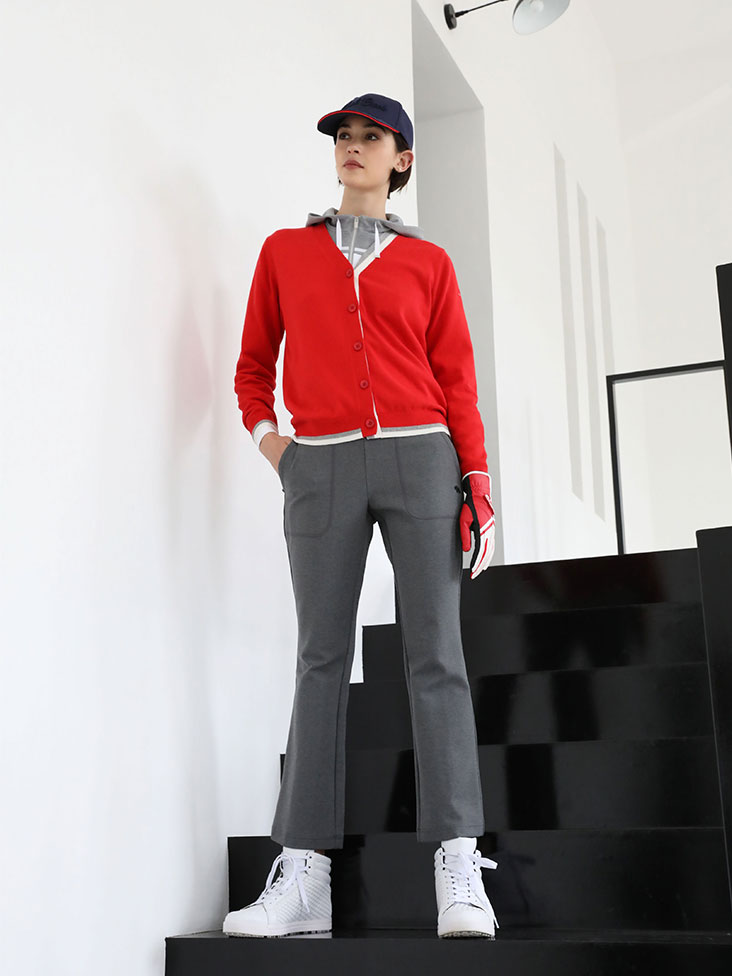 一見シンプルなVネックカーディガンですが下前立て、袖口、裾に入った配色ラインがデザインポイントに。シンプルだから合わせるアイテムを選ばず、ブーツカットタイプのボトムとの相性が◎
