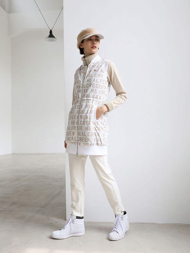ユニセックスのラウンドコート尾と同じ仕様のロングベスト。衿、AH,裾などに編立のリブを使い視覚からも暖か味を与えてくれます。大胆なロゴ柄プリントは冬のプレーも楽しく、前向きに元気を与えてくれるオリジナリティーあふれる印象に。ウエストはドロスト仕様です。
