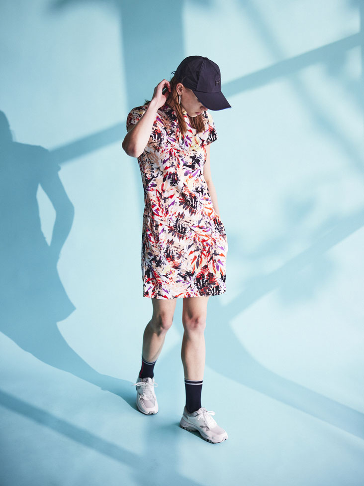 今シーズンらしい、インパクトのある華やかなリゾートテイストなプリントに対して、キャップやソックスをブラックにすることによりスポーツモード感溢れるスタイリングになりました。