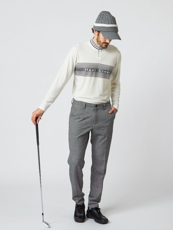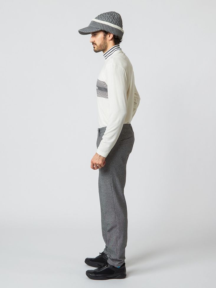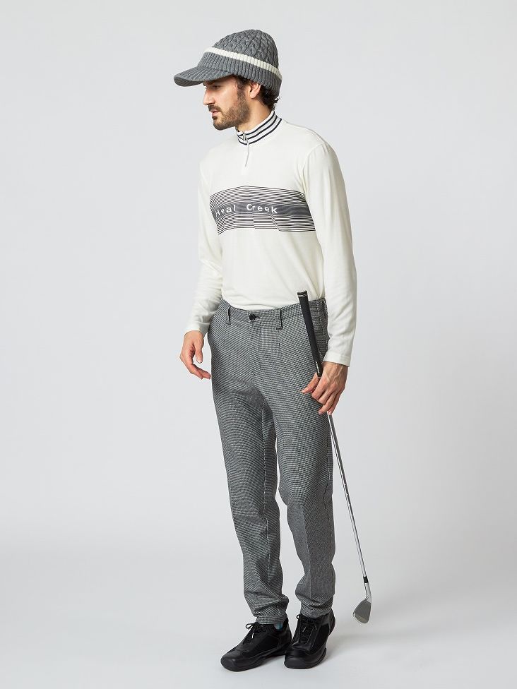 ボーダーのニット衿とグラデーションさせたボーダーを抜いたロゴがデザインポイントの機能素材シャツに、2WAYストレッチのチェック素材パンツを合わせて温かみをプラス。
