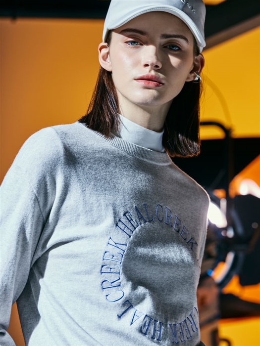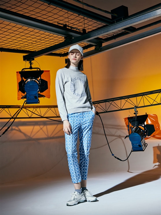 HCロゴをモノグラムに配置したテーパードシルエットのパンツに、同色系のブルー味の刺繍を施したニットを合わせました。カシミア混のリッチな肌触りとインパクトのあるパンツが大人のスポーティー感あるコーディネートになっています。パンツは撥水も効いた4WAYストレッチで機能性にも優れています。