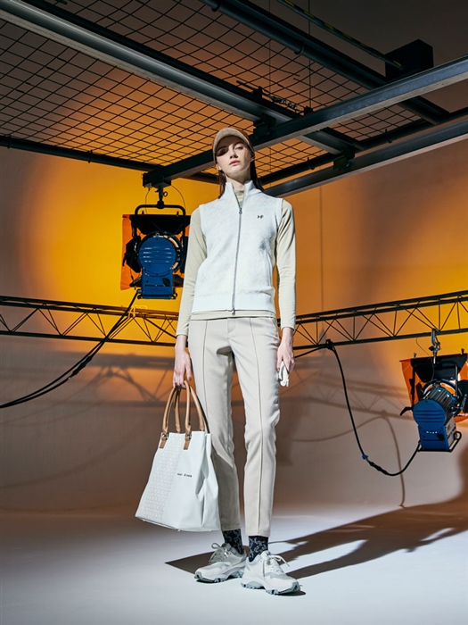美脚を追求したパンツに同色系のトップスとベストを合わせました。ベストは微配色で光沢のある糸で、モノグラム柄を編みたてたニットベストになっています。ベージュのカラートーンで合わせたコーディネートに、靴下のネイビーがきりっと引き締め帽子とバッグの合皮が全体を秋らしくまとめたスタイリングです。