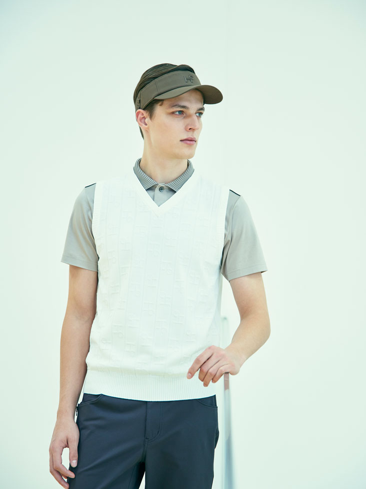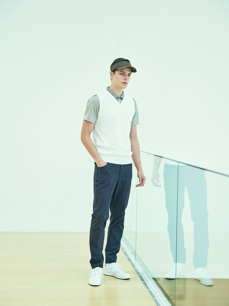 シャープなVネックのデザインが特徴のベストと、美しい見え方をするスムース素材の半袖シャツを組み合わせたスタイリング。ホワイトカラーのベストは、綺麗な印象を与えるだけでなく、洗練されたスタイルを演出します。スムース素材の半袖シャツは上品で上質な印象を与え、ベストとの相性も抜群です。さらに、肩のパイピングがアクセントになって、シャープなスポーティーさもプラスされています。チャコールのパンツとの組み合わせで大人の印象を演出し、ベージュのサンバイザーや真っ白なシューズとのコーディネートで、全体のスタイリングに華やかさと新鮮さをプラスします。オシャレなスタイリングポイントを押さえたコーディネートに是非注目してください。
