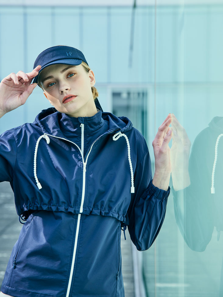 ボレロジャケットとベストの組み合わさった爽やかなブルゾンは、紺×白の配色とマリン調デザインが特徴です。ロープ使いがさりげないポイントとなり、洗練されたスタイルを演出します。ボーダーインナーと白いタイトスカート、ニーハイソックスとの組み合わせで、清潔感溢れる春のスタイリングになります。ストライプがアクセントになったシューズやサンバイザーの小物をプラスすれば、さらにフレッシュな印象に。肌寒い朝は重ね着で、日中太陽が照らしたらベストのみにと、気温変化の激しい春のラウンドに対応するブルゾンを中心にしたコーディネートです。