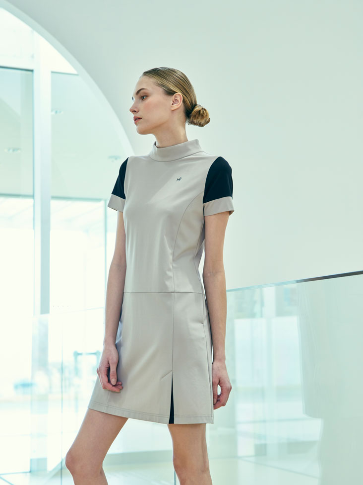 一目で目を引くシックな配色とオフネックのデザインが特徴のワンピース。ローウェスト切り替えが、落ち着いた雰囲気を演出しています。程よい肉感でキックバックのしっかりしたポンチ素材を使用し、スイングしても安心な着丈になっています。さらに、ゴルフプレイに必要な4つのポケットやDカンも備えています。プレイ後にそのまま着用しても、気後れせずに過ごせるエレガントさが魅力です。バイカラーのカートバックが、コーディネートを素敵に完成させます。