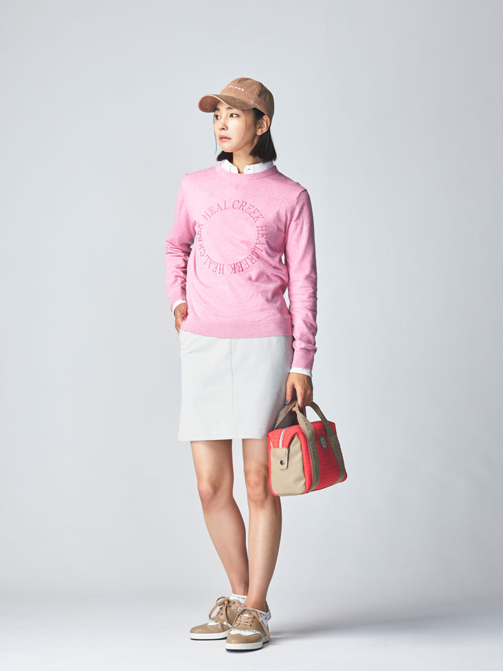 定番人気のコットンカシミアのセーターの発色の良さを活かしたカラーコーディネート。鮮やかなロゴのピンクに合わせてカートバッグにもピンクをチョイスします。ウェットスーツのような素材にエンボス加工を施したバッグはベージュのバイカラーが華やかな印象。キャップやシューズにもベージュを重ねて、ピンク×ベージュのグラデーションが優しく華やかなコーディネートになっています。