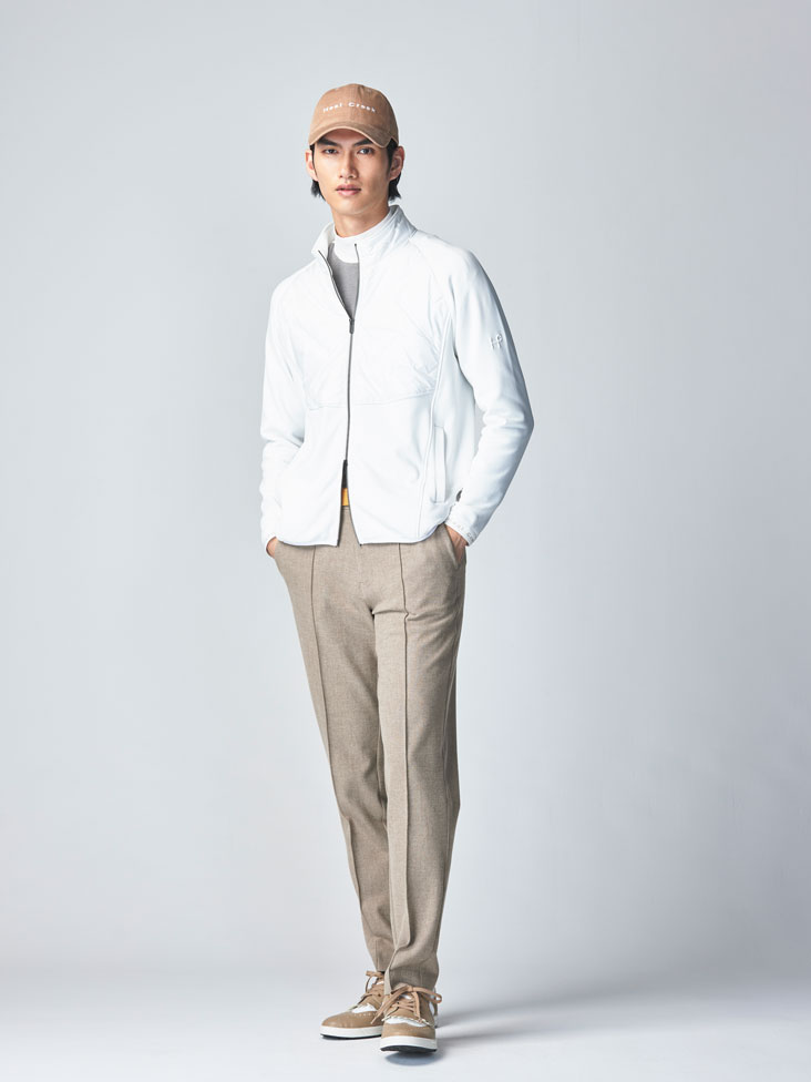 綺麗なホワイトカラーのピンソニック加工のブルゾンは、ベージュのパンツとの組み合わせで格上げされること間違いなし。さらにコーデュロイ素材のキャップが暖かさを演出。プレーから行き帰りのスタイルまで幅広く活躍する一着です。シックで都会的な印象を与えるアイテムとして、様々なシーンで使えること間違いありません。