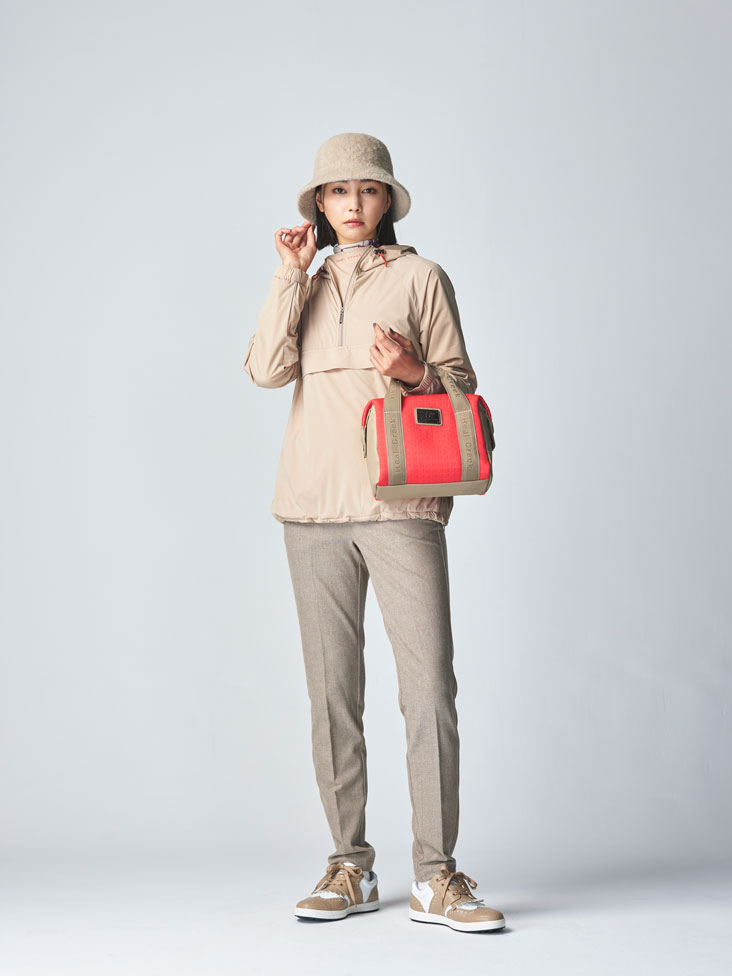 インナーのプリントやバッグにコーラルピンクのアクセントを効かせて華やかさをプラス。